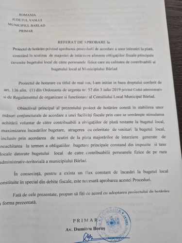 „În ședința Consiliului Local Bârlad, care a avut loc pe 31 august, am inițiat două proiecte de hotărâre prin care, atât persoanele fizice, cât și cele juridice să fie scutite de la plata penalităților de întârziere. Inițiativa a fost susținută prin vot și, prin urmare, îi așteptăm pe toți bârlădenii să își plătească obligațiile fiscale la cuantumul la care au fost ele stabilite la începutul anului. În acest fel, bugetul local, din care plătim tot ceea ce se face pentru oraș, va avea un flux constant al încasărilor, iar contribuabilii nu mai sunt nevoiți să scoată mai mulți bani din buzunar. Astfel, venim în sprijinul mediului de afaceri local, dar mai ales al oricărui cetățean care până în acest moment, din varii motive, nu a reușit să își achite taxele și impozitele locale. Tuturor le întindem o mână de ajutor pentru că știm foarte bine că sunt momente când oricine se poate confrunta cu dificultăți financiare și astfel alege să își dirijeze resursele către rezolvarea unor probleme urgente”, a declarat primarul Dumitru Boroș.