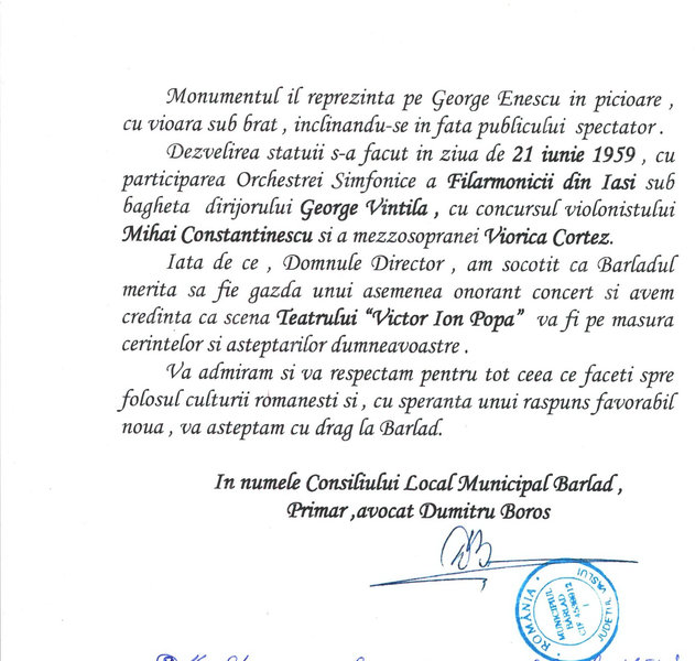 „Faptul că de astăzi suntem incluși în traseul Festivalului este o onoare și o mândrie pentru noi. Vreau să mulțumesc, în primul rând, Consiliului Local Bârlad, tuturor celorlalți sponsori care au venit alături de noi, respectiv Clubul „Rotary” Bârlad, SC Energo-Construct SRL, Florăria Alegria și teatrului bârlădean. De asemenea, trebuie să îi mulțumim domnului Doru Marin, alături de care ne manifestăm și noi speranța că acest eveniment inedit va fi un proiect cultural de succes pentru municipiul Bârlad. Camerata Regală și violonista Rebekka Hartmann sunt, de altfel, garanția succesului acestui eveniment!”, a spus primarul Dumitru Boroș.