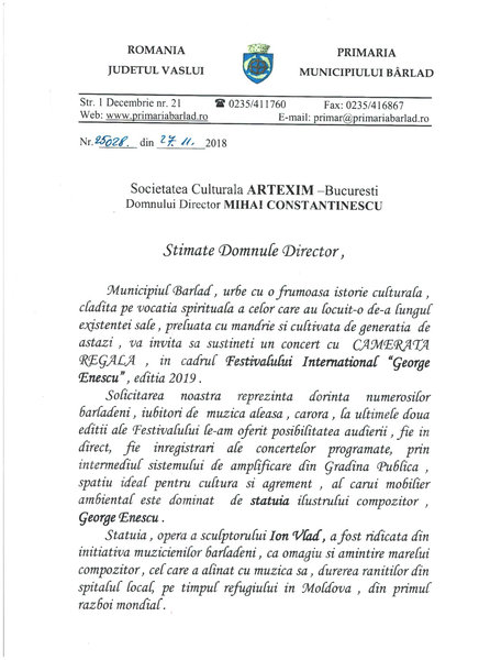 Având în vedere inițiativa autorităților locale bârlădene (nr. 25028/27.11.2018), organizatorii au ținut să remarce interesul pe care Bârladul – o localitate fără o filarmonică, dar cu un trecut și un prezent muzical de excepție – l-a manifestat pentru prestigiosul festival.