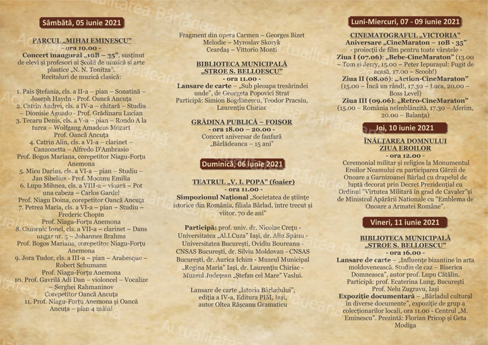 Zilnic, programul detaliat va fi postat pe pagina noastră de Facebook și pe site-ul www.primariabarlad.ro, precum și pe canalele de comunicare oficiale ale partenerilor noștri media.
