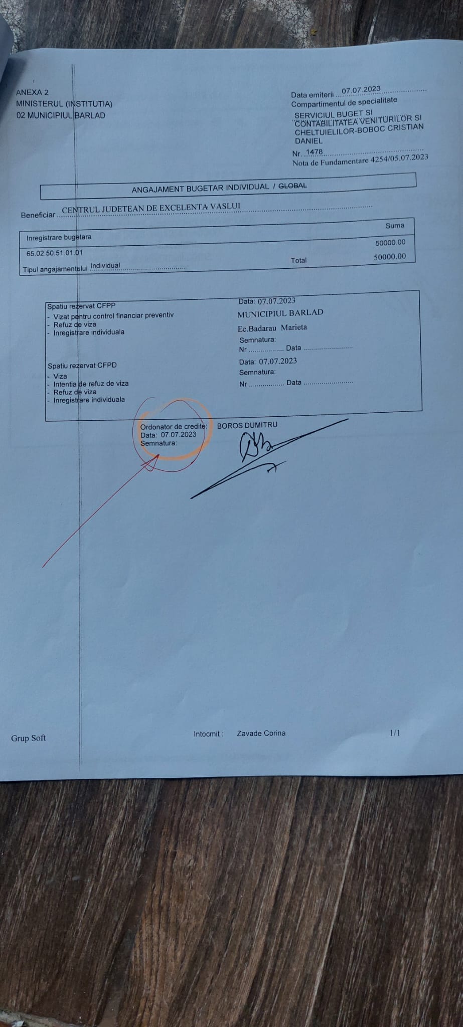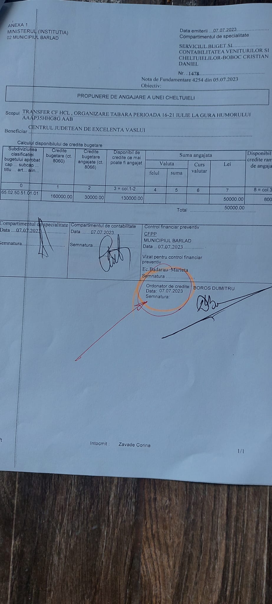 * documentele pentru finanțarea cu suma de 50.000 de lei a taberei de vară în care vor merge elevii din cadrul Centrului Județean de Excelență Vaslui, au primit toate vizele și semnăturile necesare pe data de 7 iulie 2023, la exact o zi după solicitarea transmisă de doamna Gabriela Plăcintă și înregistrată la Primăria Bârlad (foto 1 și foto 2)