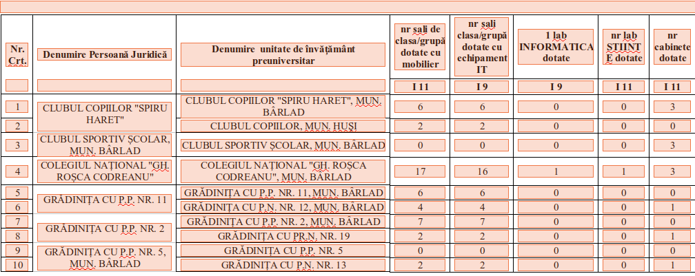 Unitățile care vor beneficia de noile investiții sunt: Clubul copiilor ”Spiru Haret”, Clubul Școlar Sportiv, Colegiul ”Codreanu”, Grădinițele 11, 12, 2, 19, 5, 13, 8, 3, 7, 9, 15, 20, 4, 17, 18, 23, Liceul Pedagogic ”Ioan Popescu”, Liceul Tehnologic ”Petru Rareș”, Liceul ”M. Eminescu”, Școala de Arte ”N.N. Tonitza”, școlile ”G. Tutoveanu”, ”I. Radu”, ”M. C. Epureanu”, ”Principesa E. Bibescu”, ”V.I Popa”, ”Stroe B. Belloescu”, ”V. Pârvan”, ”Ep. I. Antonovici”, Liceul ”Al. I. Cuza” și cele două creșe.