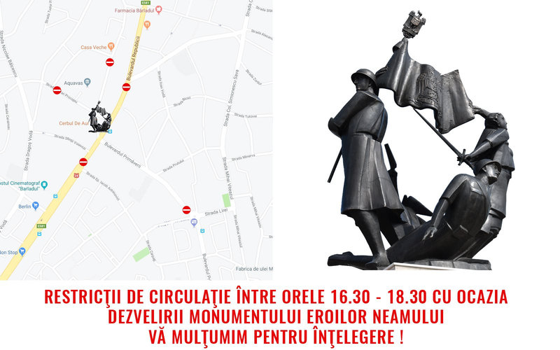Astăzi, în intervalul orar 16.30-18.30, traficul rutier pe Bulevardul Republicii (DE 581), în zona „Cerbul de aur”, va fi restricționat temporar prin închiderea circulației, tronsonul cuprins între intersecția cu strada Popa Șapcă (dinspre nord) și strada Episcop Iacov Antonovici (dinspre sud) cu deviere pe următoarele rute:
