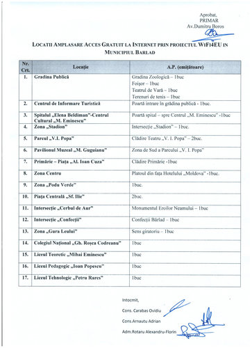 „Zonele în care s-a ales să fie furnizat internet gratuit cu ajutorul acestui voucher au fost selectate atent, în funcție, evident, de cerințele principale de calificare pentru voucherul UE, dar și de cele ale oamenilor, care frecventează des anumite locuri din Bârlad și unde și-ar dori sa aibă acces gratuit la internet. Vom acoperi, așadar, toate locurile aglomerate din oraș, de la Grădina Publică, Spital, Stadion, Parc, Centru, Piață, Cerbul de aur, Confecții și în zona liceelor din municipiu. Acest voucher l-am câștigat în luna mai și de atunci au și început lucrările de montaj și achiziția de echipamente. Acum rețeaua este funcțională în totalitate”., a declarat primarul Dumitru Boroș.
